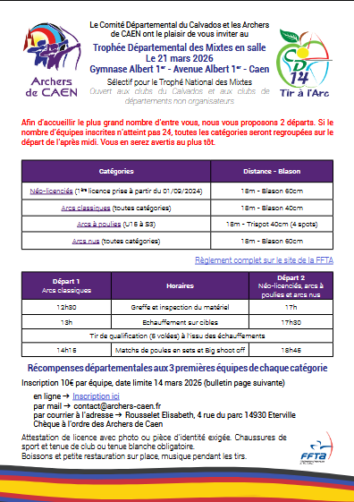 Inscription En ligne: https://www.helloasso.com/associations/archers-de-caen/evenements/trophee-des-mixtes-2026